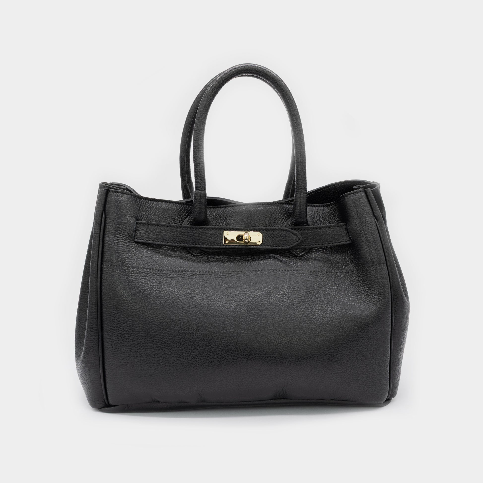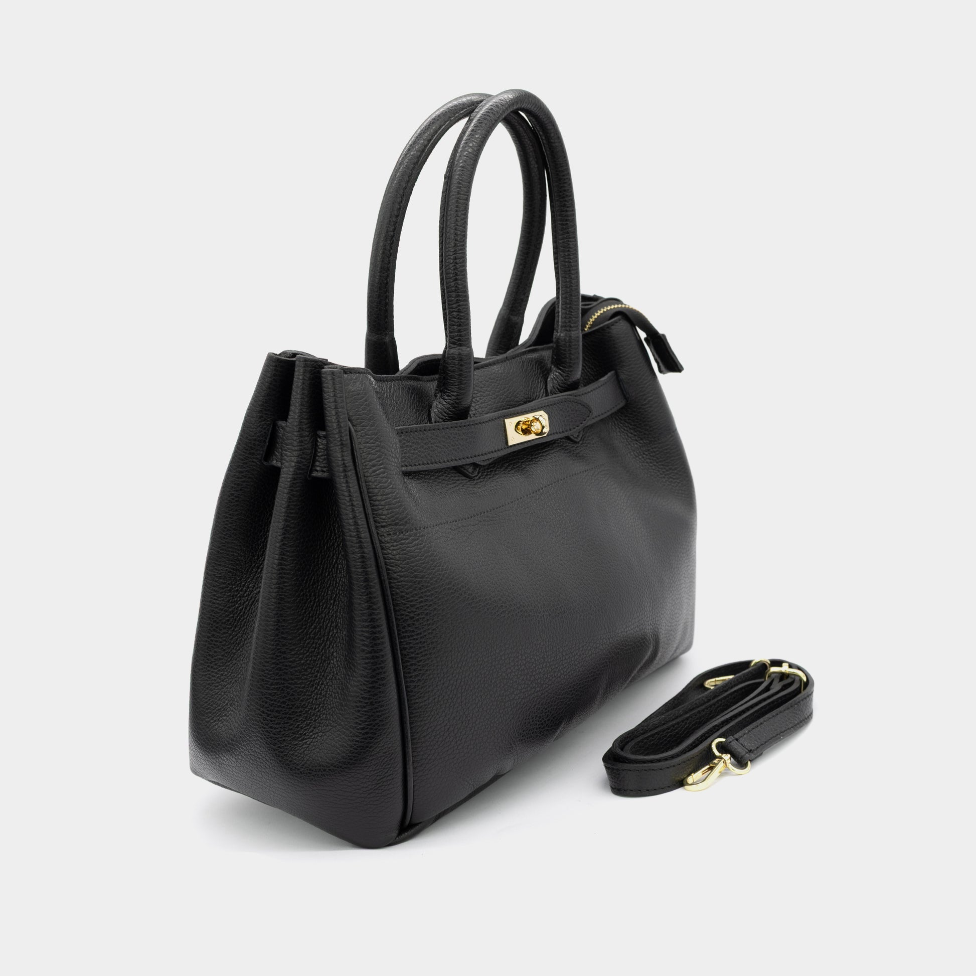 Ova elegantna ženska torba od prirodne kože u klasičnoj crnoj boji savršen je spoj profinjenosti, praktičnosti i luksuza. Izrađena od vrhunske zrnaste kože, pruža dugotrajnost i sofisticiran izgled koji se lako uklapa uz svaku odevnu kombinaciju — bilo poslovnu, svakodnevnu ili večernju. Model je inspirisan klasičnim “structured” dizajnom i odiše suptilnom elegancijom. Zahvaljujući dvostrukim ručkama i podesivom kaišu, torba se može nositi u ruci, preko ramena ili ukoso. Zlatna dekorativna kopča na preklopu dodaje notu luksuza i prepoznatljivosti. Prostrana unutrašnjost omogućava lako organizovanje svih potrepština, dok čvrsta konstrukcija zadržava elegantnu formu torbe.