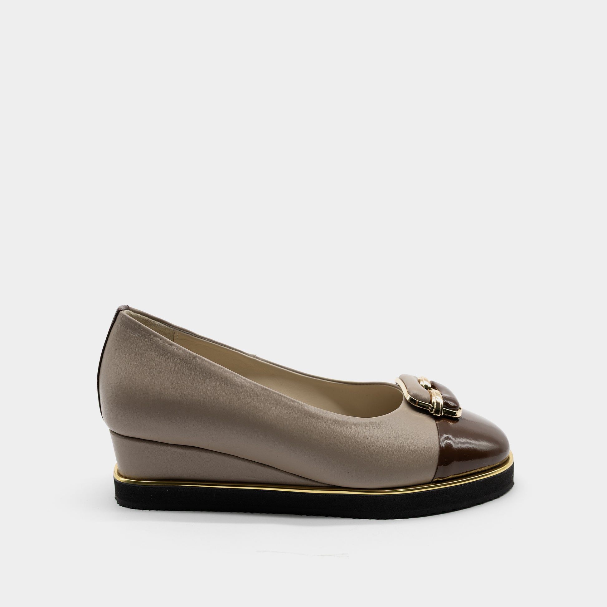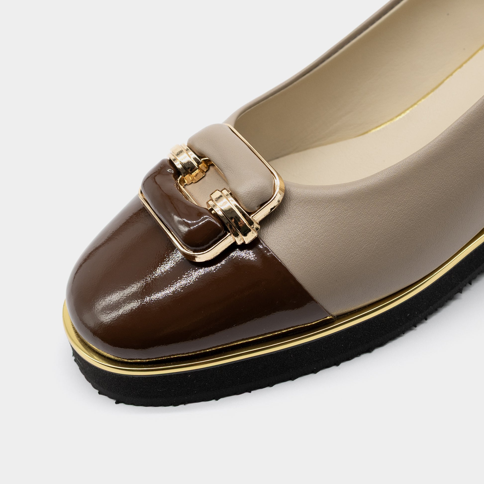 Ove cipele od prirodne kože kombinuju bež i tamno braon tonove u savršenom skladu elegancije i modernog stila. Lakirani vrh u braon nijansi daje sofisticiran završetak, dok zlatni metalni detalj na gornjem dijelu naglašava luksuzan karakter modela. Cipele su postavljene na diskretnu platformu koja osigurava udobnost i stabilnost tokom cijelog dana. Idealne su za žene koje preferiraju spoj udobnosti i profinjenosti, bilo za poslovni dan ili elegantan večernji izlazak.
