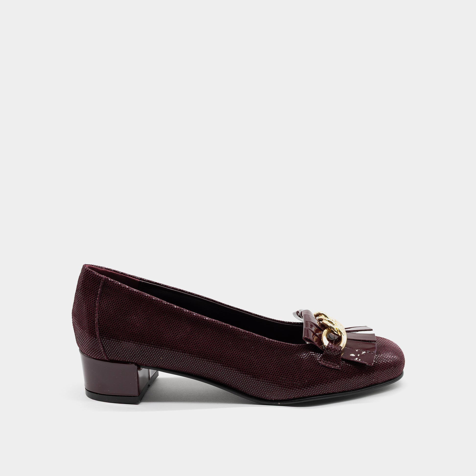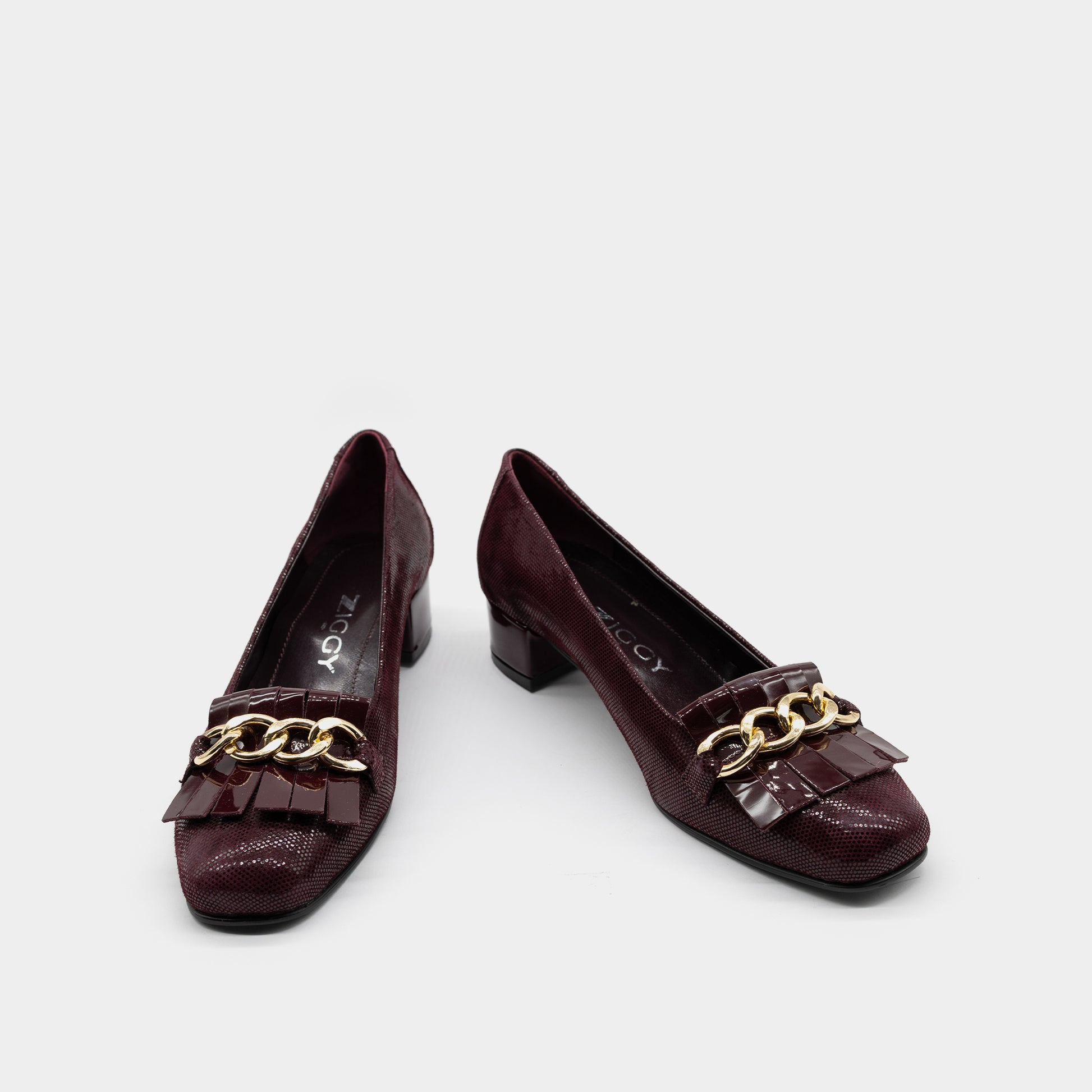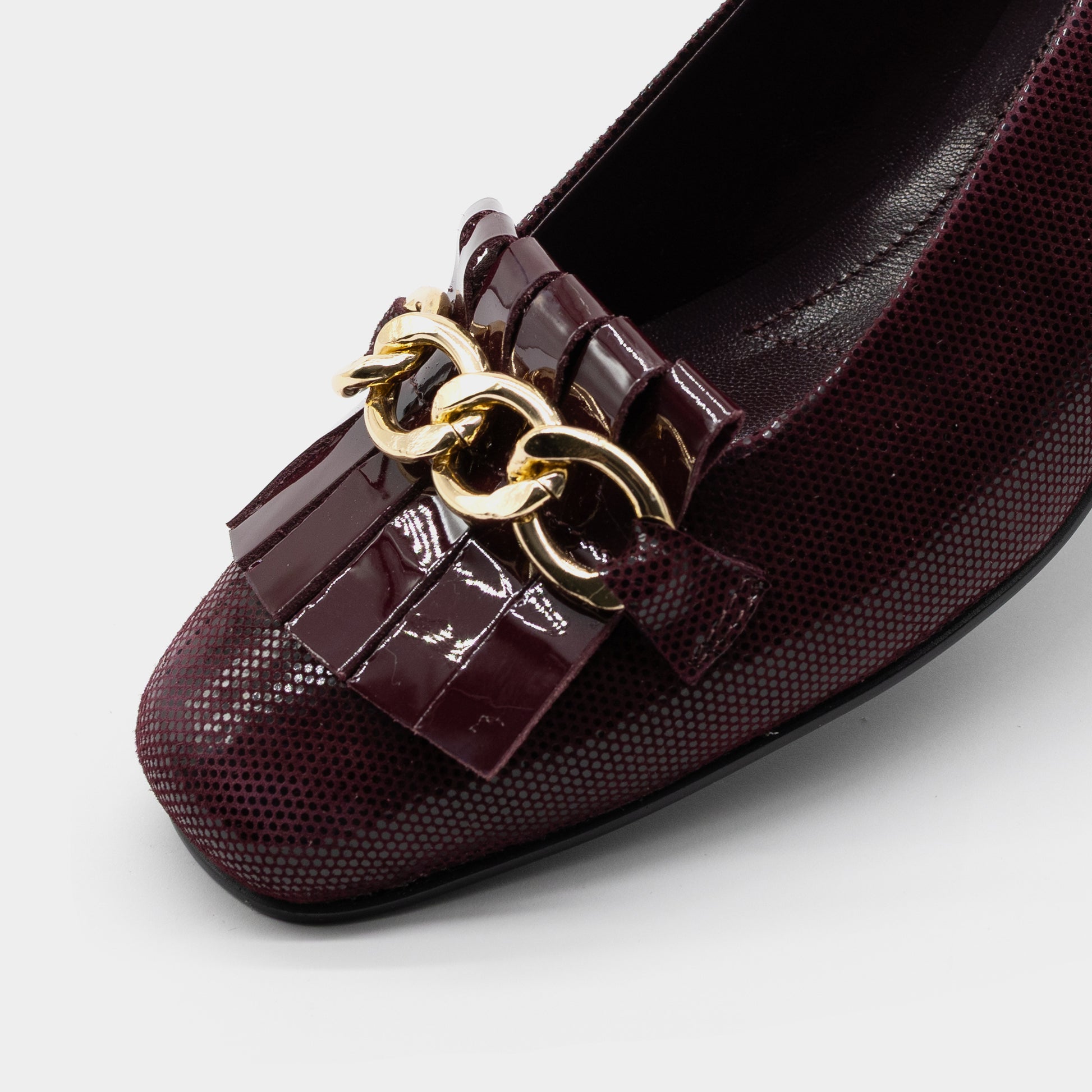 Ove ženske cipele bordo boje kombinuju klasičnu eleganciju i moderan dizajn, savršene za sve prilike. Izrađene su od kvalitetnog materijala sa suptilnim sjajem, dok lakovani detalji i zlatni lanac na prednjem dijelu daju prepoznatljiv i luksuzan izgled. Niska blok peta pruža stabilnost i udobnost pri hodu, što ih čini idealnim za cjelodnevno nošenje. Bordo nijansa je svestrana i lako se uklapa uz poslovne, svečane ili svakodnevne kombinacije, dajući svakoj odjevnoj kombinaciji dašak sofisticiranosti i stila.