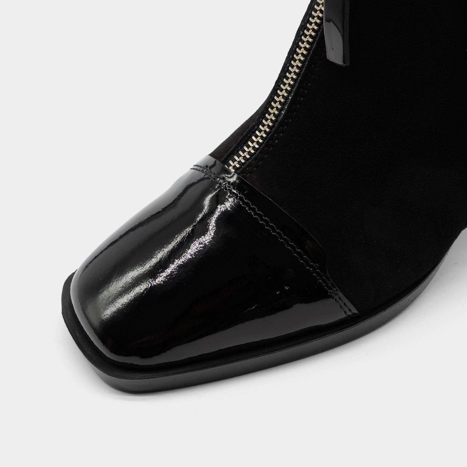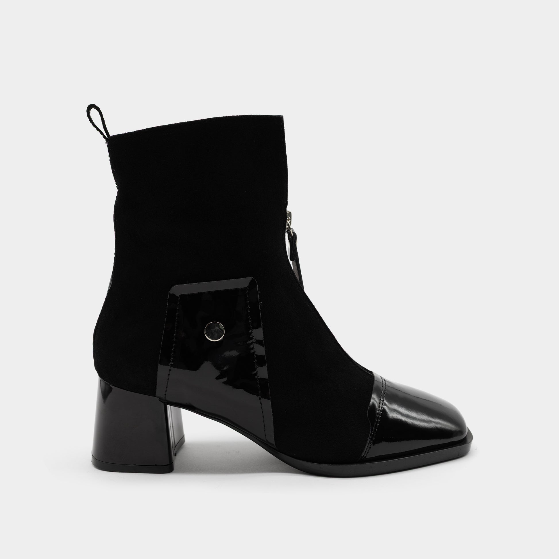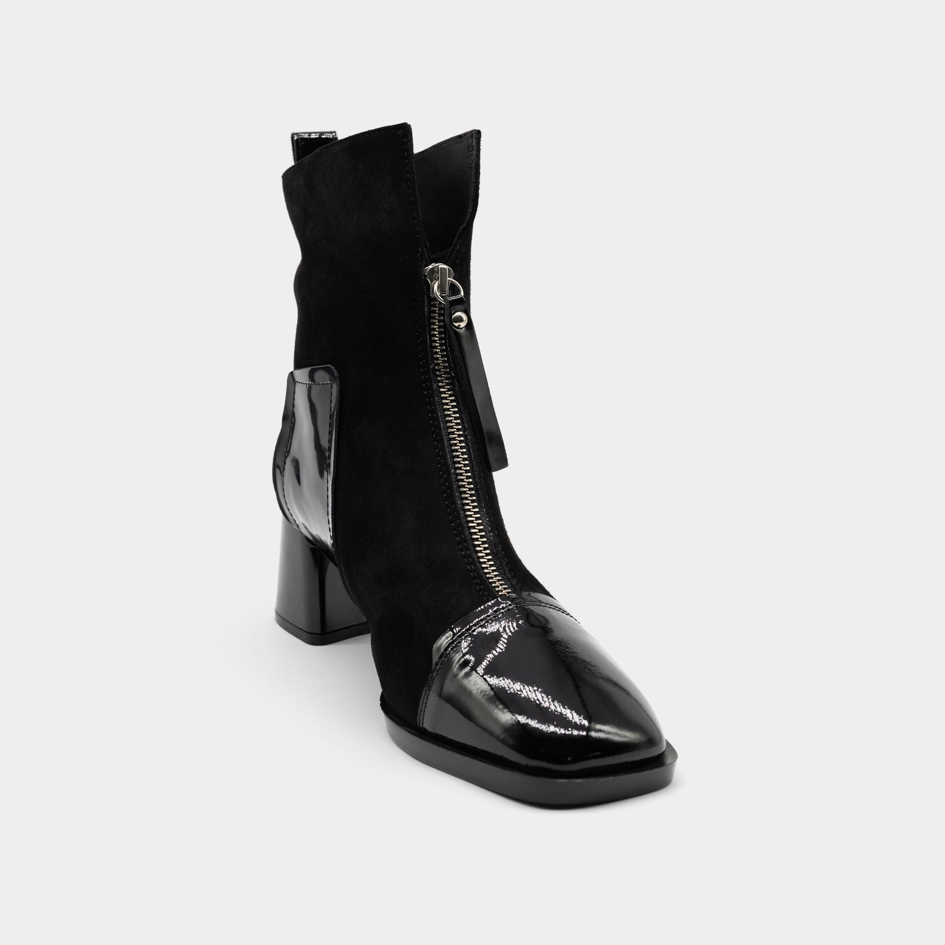 Ove ženske crne gležnjače donose elegantan spoj mekog antilopa i sjajne lakirane eko kože, stvarajući savršenu ravnotežu između klasičnog i modernog. Sa kvadratnim vrhom i udobnom blok potpeticom, idealne su za svakodnevno nošenje, ali i za večernje prilike. Rajsferšlus sprijeda olakšava obuvanje, dok dekorativni detalji od laka daju dozu luksuza. Ove gležnjače su pravi izbor za žene koje žele sofisticiran izgled uz potpunu udobnost i prepoznatljiv stil.