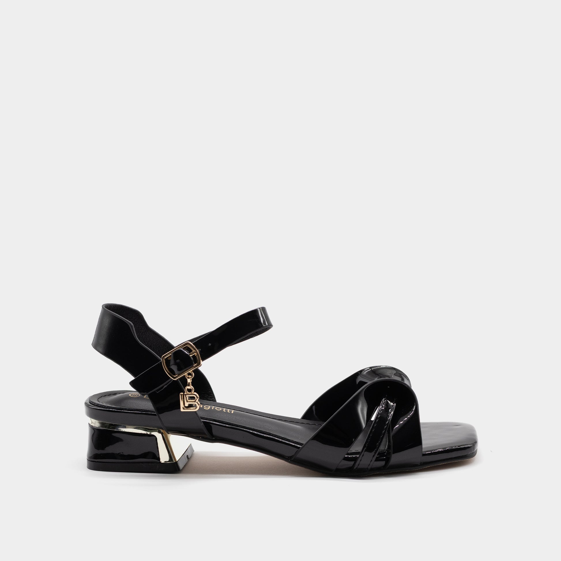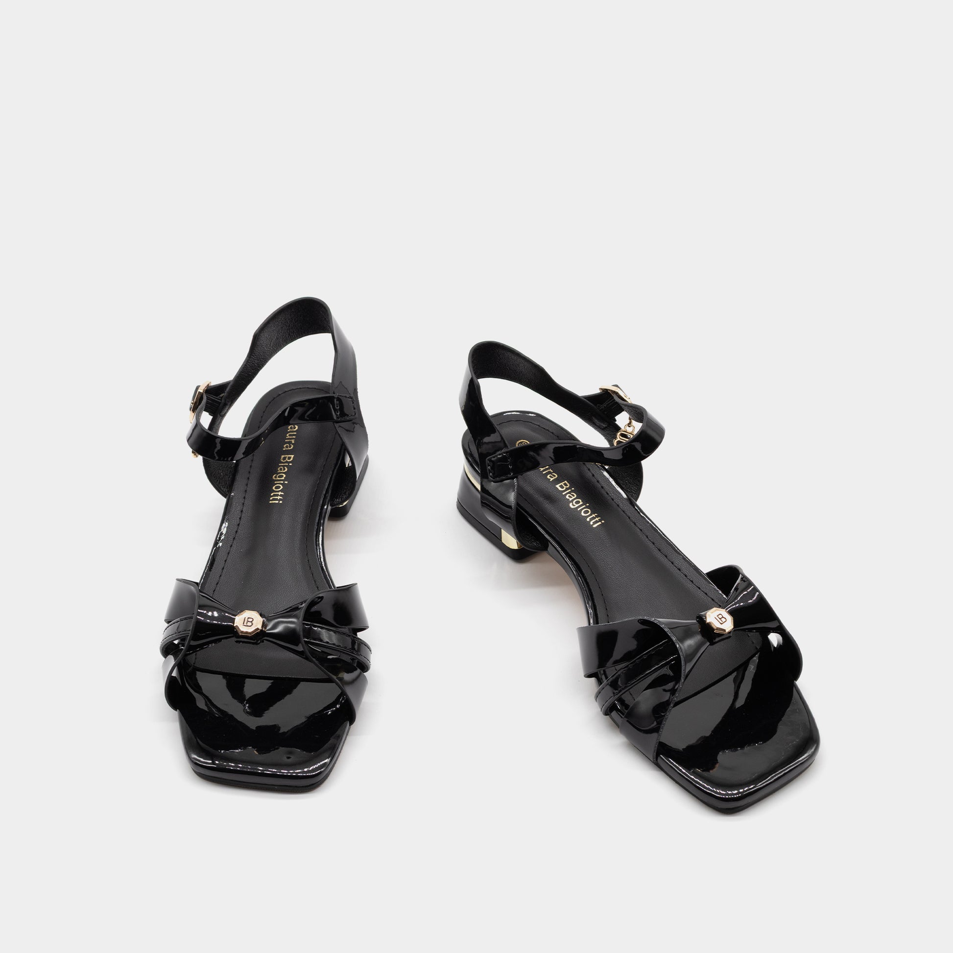 Ove sandale donose spoj glamura i udobnosti – sjajna lak koža, prepoznatljiv LB privezak i niska potpetica sa zlatnim akcentom. Kaiš oko zgloba pruža dodatnu stabilnost, dok minimalistički dizajn čini ovaj model idealnim za dnevne i večernje prilike. Praktičan izbor za sofisticiran letnji stil.